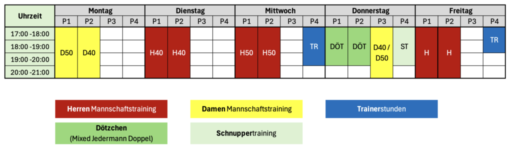 Nur während der Trainingszeiten unserer Mannschaften (Montag bis Freitag) sind einige Plätze fest vergeben. Wann welche Plätze (ab 17 Uhr) für Training oder Mannschaften reserviert sind, seht Ihr hier in unserer Übersicht: